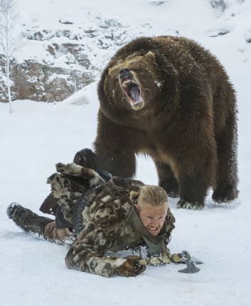 Увы, во времена викингов люди не носили зонтов и рюкзаков, и им приходилось отпугивать медведей своими способами — иногда удачно, иногда не очень. Судя про представленным фотокадрам, Бьорну (Александр Людвиг), наследнику Рагнара Лодброка (Трэвис Фиммел), предоставится отличный шанс проявить себя настоящим мужчиной.