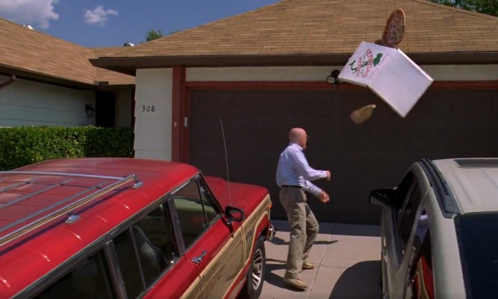 Жертвой вандалов стали не только дорожные указатели. Часть интерьерных сцен в доме Уайтов снималась в павильоне, а для натурных съемок авторы сериала арендовали симпатичный коттедж. После выхода серии «Конь без клички» жильцы дома начали жаловаться на поклонников драмы, которые пытались повторить знаменитый трюк Уолтера. В результате едва ли не каждый день рядом с коттеджем и на его крыше появлялась новая пицца. Любопытно, что сам Крэнстон забросил кругляш с первого дубля. «Когда я впервые увидел ту пиццу, она показалась мне размером с Бьюик, — вспоминает актер. — Они накрошили туда кучу добавок. Пицца была настолько тяжелой, что мне пришлось держать коробку двумя руками. Я не понимал, как смогу забросить ее на крышу. Ситуацию осложняло то, что все должно было выглядеть абсолютной случайностью. Мы выставили камеры, я изобразил злость и выпустил коробку из рук. Пицца приземлилась просто идеально. Я услышал восторженные вздохи участников съемочной группы, но не стал останавливаться, сел в машину и начал отъезжать от дома. Режиссер скомандовал "Стоп". Я вышел из машины, а мне говорят: "Лучшего броска просто нельзя представить, но давай все-таки снимем запасной дубль"».